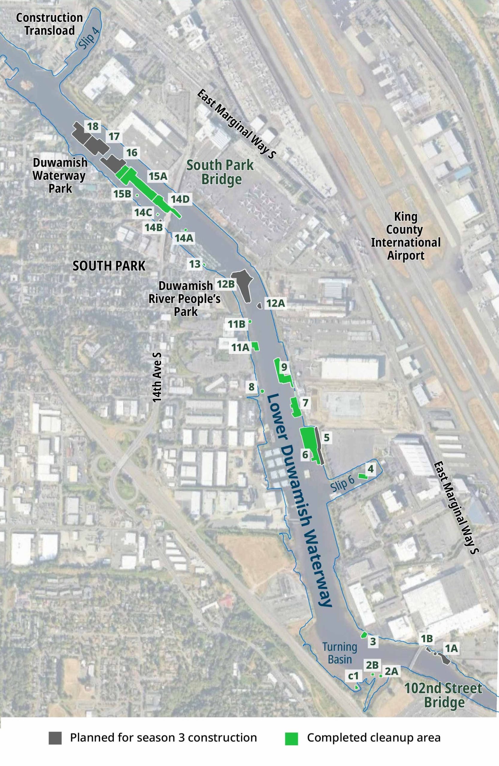 Construction will take place in specific areas within the waterway’s upper reach, which extends from the South 102nd Street bridge downstream to the Duwamish Waterway Park.